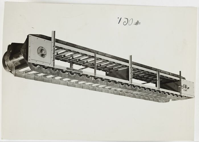 Handwritten in black ink on the front of photograph: '#OC1.' Handwritten in black ink on the back of photograph: '1. / Apron Feeding Conveyor - built for Thos. / Borthwick & Sons - Braybrook on Or 29563 - 1930'' Handwritten in grey pencil on the back of photograph: '3-D' Handwritten in red pencil on the back of photograph: 'OFFICE / COPY' Printed in black ink on back of photograph: 'PHOTO FILE NO / SECTION / NO.' Printed in red ink on back of photograph: '17 OCT 1930' Printed in purple ink on back of photograph: 'Kerr / BROS. / COMMERCIAL / PHOTOGRAPHERS / 533 COLLINS ST. MELBOURNE'