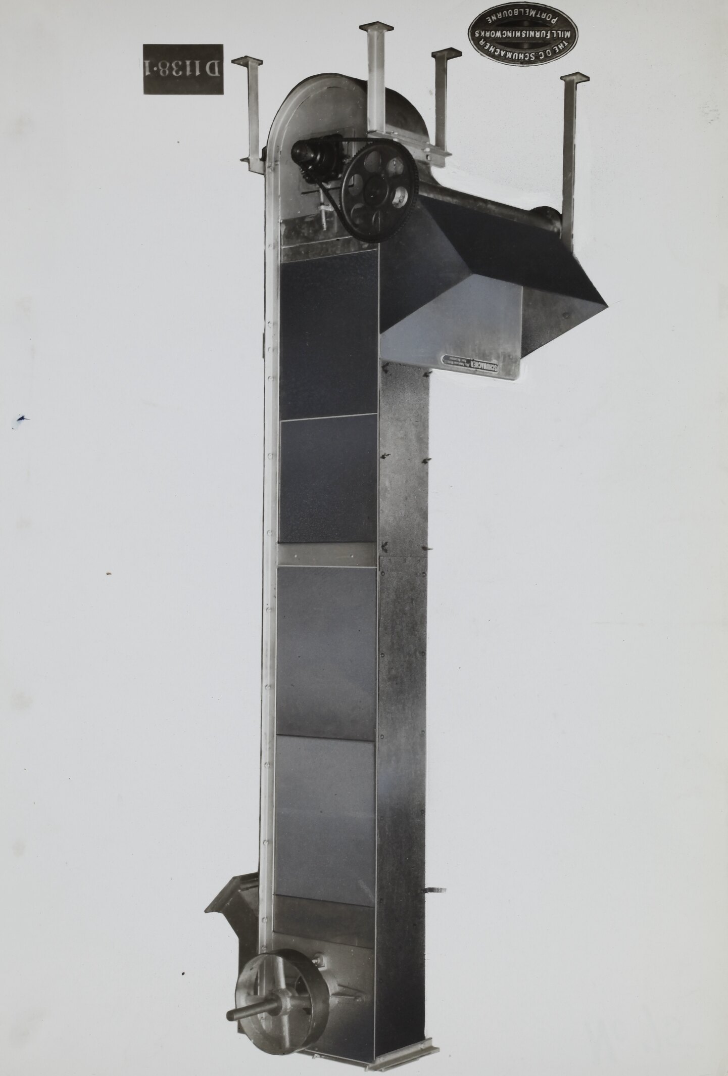 Black and white promotional image of a bucket elevator. It is part of a collection of photographs and marked printer's copy used in the preparation of trade literature promoting products manufactured by the Schumacher Mill Furnishing Works Pty Ltd. The items were originally housed in a wooden filing drawer, with many filed by subject.