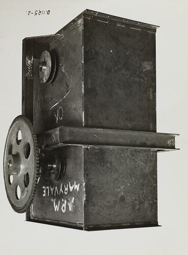 Printed on the front of photograph: 'D. 1125-2' Handwritten in black ink on the back of photograph: 'No 48' Handwritten in red pencil on the back of photograph: 'OFFICE / COPY Printed in black ink on cream label attached to back of photograph: '"PERFECT" DISCHARGE TYPE BUCKET ELEVATOR / 39'6" VENTRES - HEAD SECTION.' Printed in red ink on cream label attached to back of photograph: 'O.N. 41604 - dated 12/11/41.' Printed in purple ink on back of photograph: 'Kerr / BROS. / COMMERCIAL / PHOTOGRAPHERS / 533 COLLINS ST. MELBOURNE'