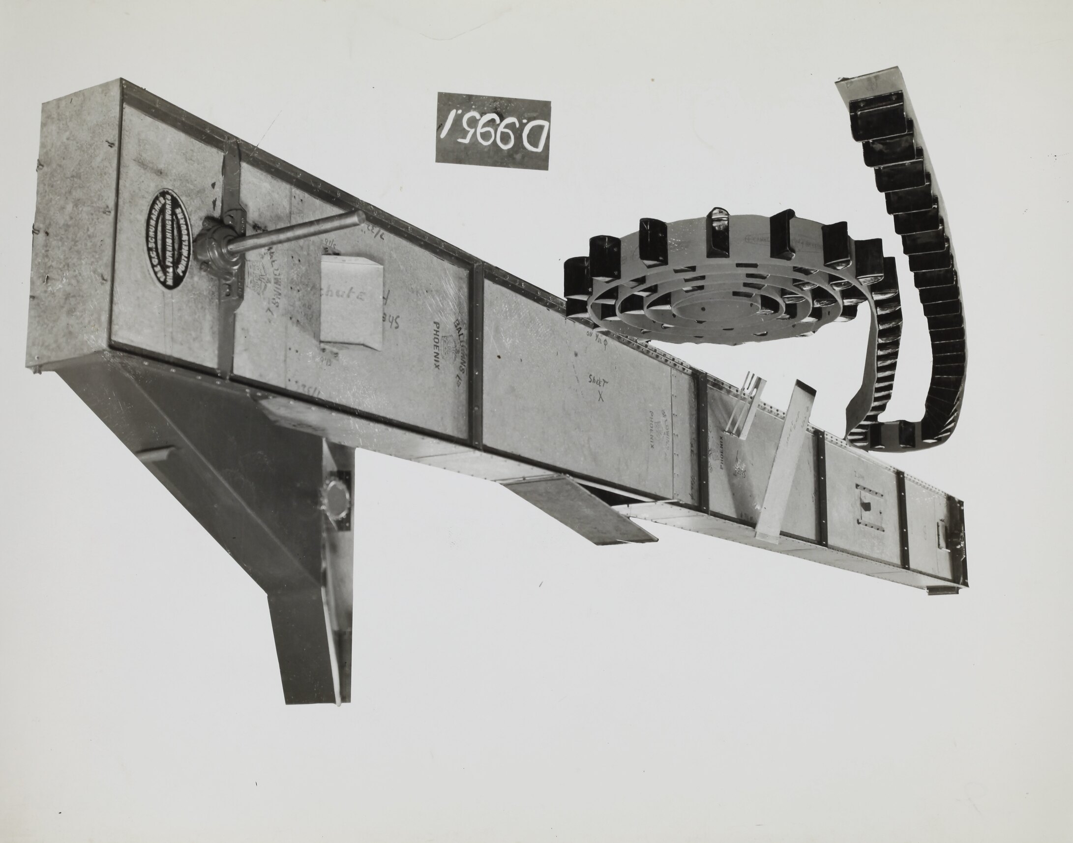 Printed on the front of photograph: 'D. 995-1.' Handwritten in black ink on the back of photograph: '48.' Handwritten in grey pencil on the back of photograph: '6' Printed in purple ink on back of photograph: 'Kerr / BROS. / COMMERCIAL / PHOTOGRAPHERS / 533 COLLINS ST. MELBOURNE' Printed in black ink on back of photograph: 'PHOTO FILE NO / SECTION NO / OFFICE COPY ONLY / WET MALT ELEVATOR .. SHEET STEEL CONSTRUCTED BUCKET / ELEVATOR, APPROX 30' CENTRES'