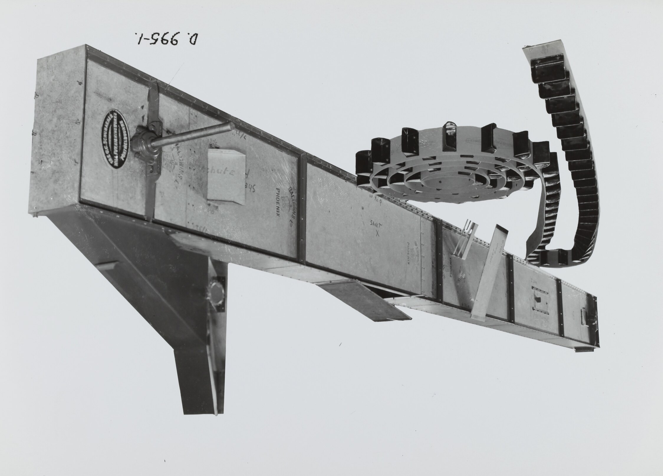 Black and white promotional image of a wet malt elevator. It is part of a collection of photographs and marked printer's copy used in the preparation of trade literature promoting products manufactured by the Schumacher Mill Furnishing Works Pty Ltd. The items were originally housed in a wooden filing drawer, with many filed by subject.