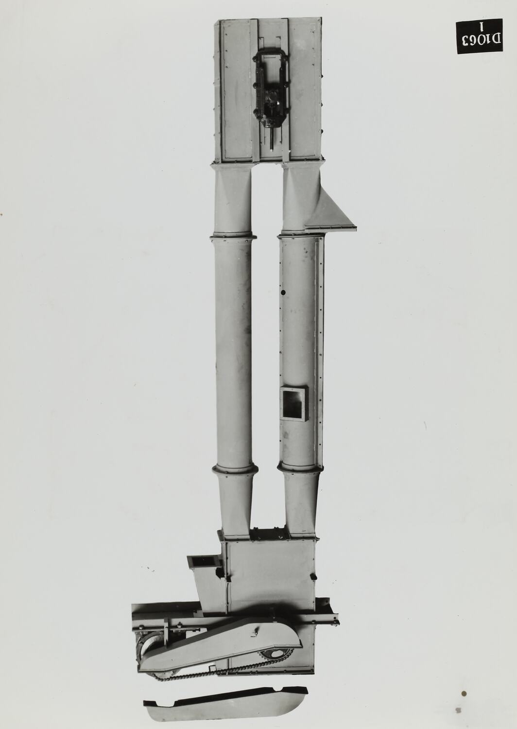 Printed on the front of photograph: 'D.1063 / 1.' Handwritten in black ink on the back of photograph: '33.' Handwritten in grey pencil on the back of photograph: '6 / yes' Handwritten in red pencil on the back of photograph: 'OFFICE COPY' Printed in black ink on cream label attached to back of photograph: 'From / Schumacher Mill Furnishing Works / PROPRIETARY LIMITED. / APPROX. 40'0" C/s 6" x 4" CUP TYPE / "J" BELT ELEVATOR. / SUPPLIED TO BALLARAT BREWING CO. / BALLARAT. VIC. / PORT MELBOURNE, / VICTORIA.' Printed in red ink on cream label attached to back of photograph: 'ORDER NO. 37484 - dated 14/7/38.' Printed in red ink on the back of photograph: 'PHOTO FILE NO / SECTION NO'