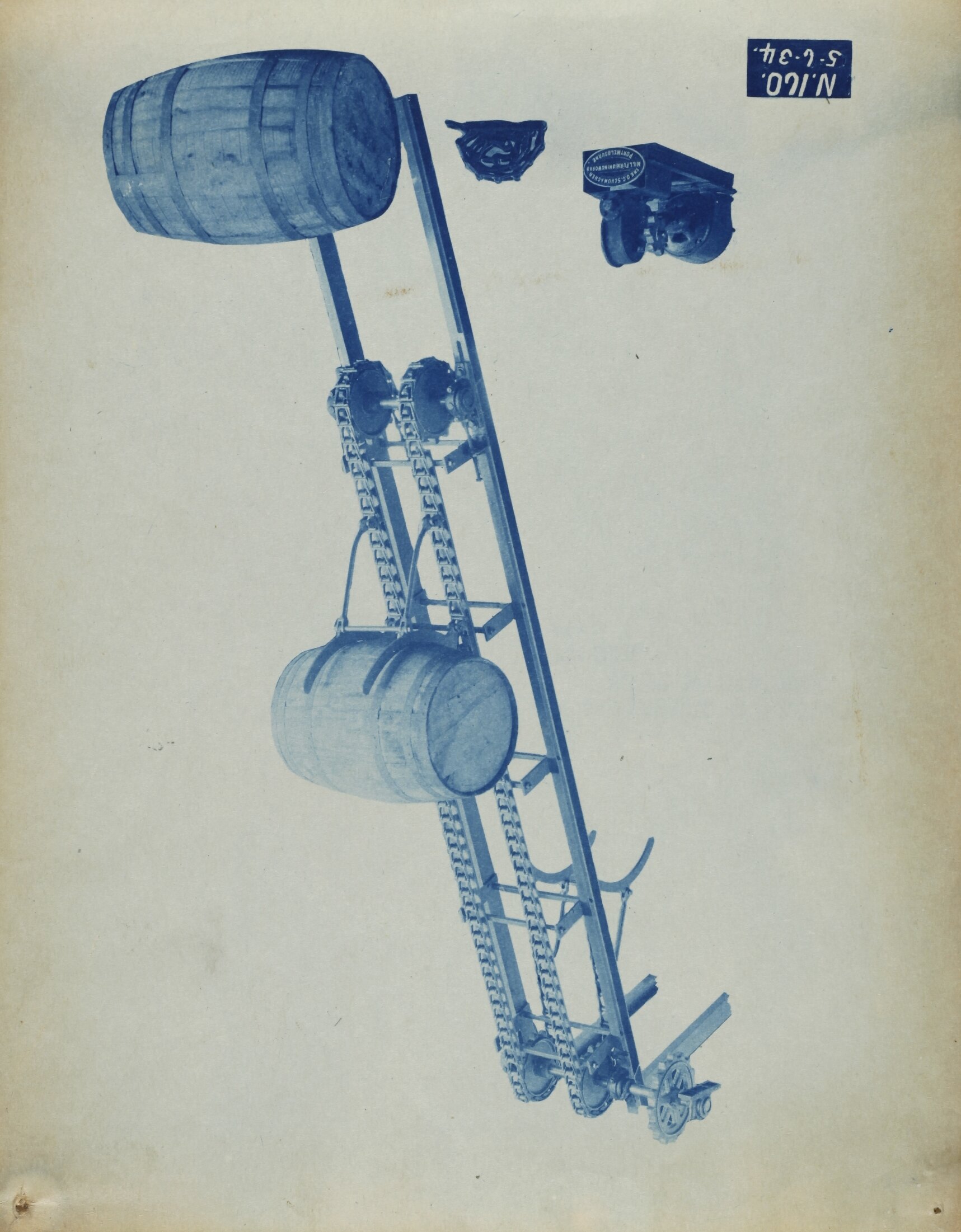 Cyanotype promotional image of a barrel elevator. It is part of a collection of photographs and marked printer's copy used in the preparation of trade literature promoting products manufactured by the Schumacher Mill Furnishing Works Pty Ltd. The items were originally housed in a wooden filing drawer, with many filed by subject.