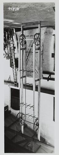 Black and white promotional image of an elevator in a factory. It is part of a collection of photographs and marked printer's copy used in the preparation of trade literature promoting products manufactured by the Schumacher Mill Furnishing Works Pty Ltd. The items were originally housed in a wooden filing drawer, with many filed by subject.