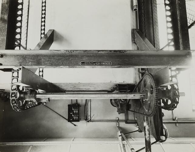 Black and white promotional image of a platform elevator. It is part of a collection of photographs and marked printer's copy used in the preparation of trade literature promoting products manufactured by the Schumacher Mill Furnishing Works Pty Ltd. The items were originally housed in a wooden filing drawer, with many filed by subject.