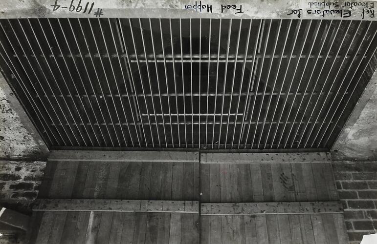 Handwritten in black ink on the front of photograph: 'Ref Elevators for / Elevator Supplied / Feed Hopper / #1199-4' Printed in black ink on cream label attached to back of photograph: 'From / Schumacher Mill Furnishing Works / PROPRIETARY LIMITED. / COAL STORAGE BUNKER AND COAL / HANDLING ELEVATOR EQUIPMENT. / Supplied under Or. No. 41104, / 41105, / 41106. / dated 14/7/41. / PORT MELBOURNE, / VICTORIA.' Printed in red ink on back of photograph: 'OFFICE COPY'