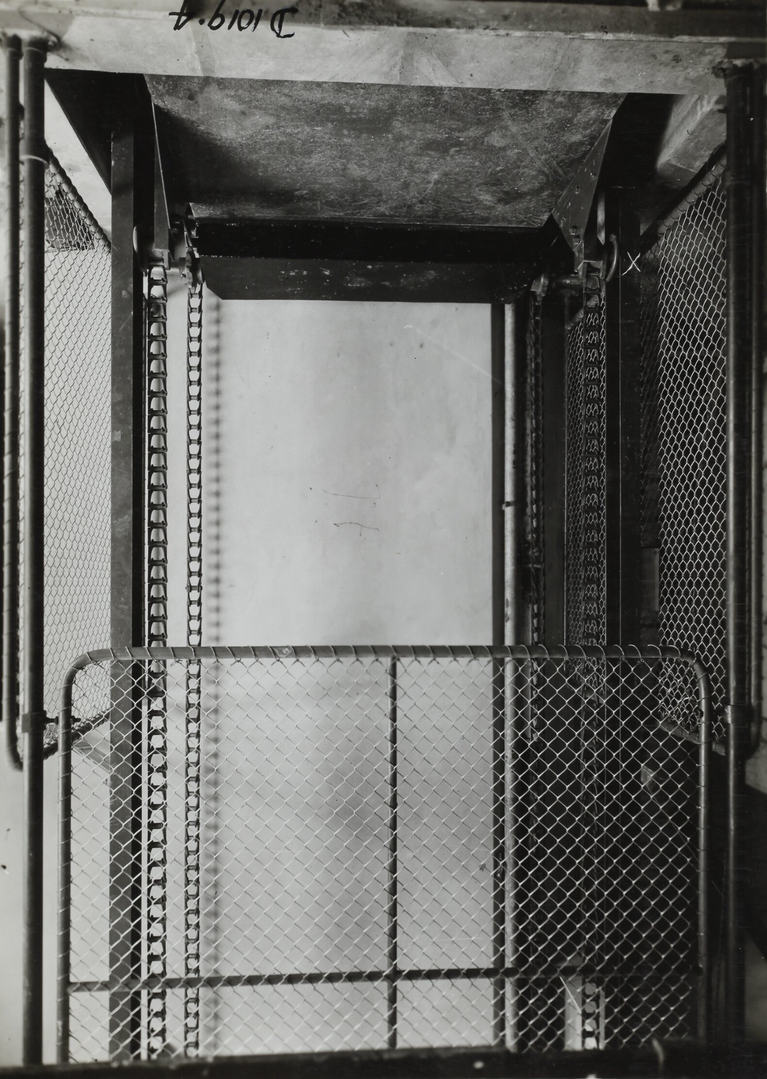 Handwritten in black ink on the front of photograph: 'D 1019.4.' Printed in black ink on back of photograph: 'PHOTO FILE NO. / VIEW OF BOTTOM PORTION. / OR. 35409 - - - / NOTE...LOCKWOOD STUDIOS GEELONG HAVE PLATE (DO / NOT SELL PLATE TO THEIR CUSTOMERS) / The Lockwood Studios / Geelong' Printed in red ink on back of photograph: 'SECTION NO / OFFICE COPY / PLATFORM ELEVATOR.' Handwritten in black ink on the back of photograph: '47.' Handwritten in grey pencil on the back of photograph: '6'