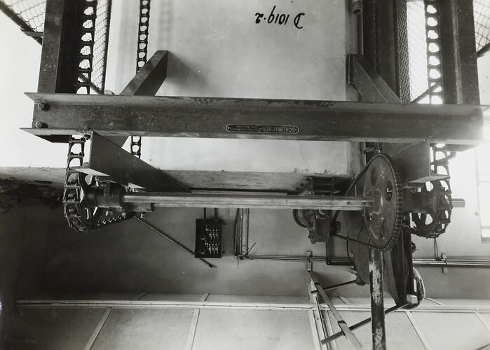 Handwritten in black ink on the front of photograph: 'D 1019.2.' Printed in black ink on back of photograph: 'PLATFORM ELEVATOR - - REF. Or.35409 / HEAD VIEW - - close-up. / NOTE...LOCKWOOD STUDIOS, GEELONG / HAVE PLATE (DO NOT SELL TO / CUSTOMERS) / The Lockwood Studios / Geelong.' Printed in red ink on back of photograph: 'PHOTO FILE NO / SECTION NO / OFFICE COPY' Handwritten in black ink on the back of photograph: '45.' Handwritten in grey pencil on the back of photograph: '6'