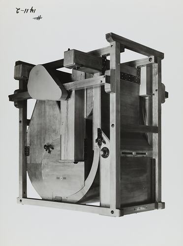 Black and white promotional image of a machine. It is part of a collection of photographs and marked printer's copy used in the preparation of trade literature promoting products manufactured by the Schumacher Mill Furnishing Works Pty Ltd. The items were originally housed in a wooden filing drawer, with many filed by subject.