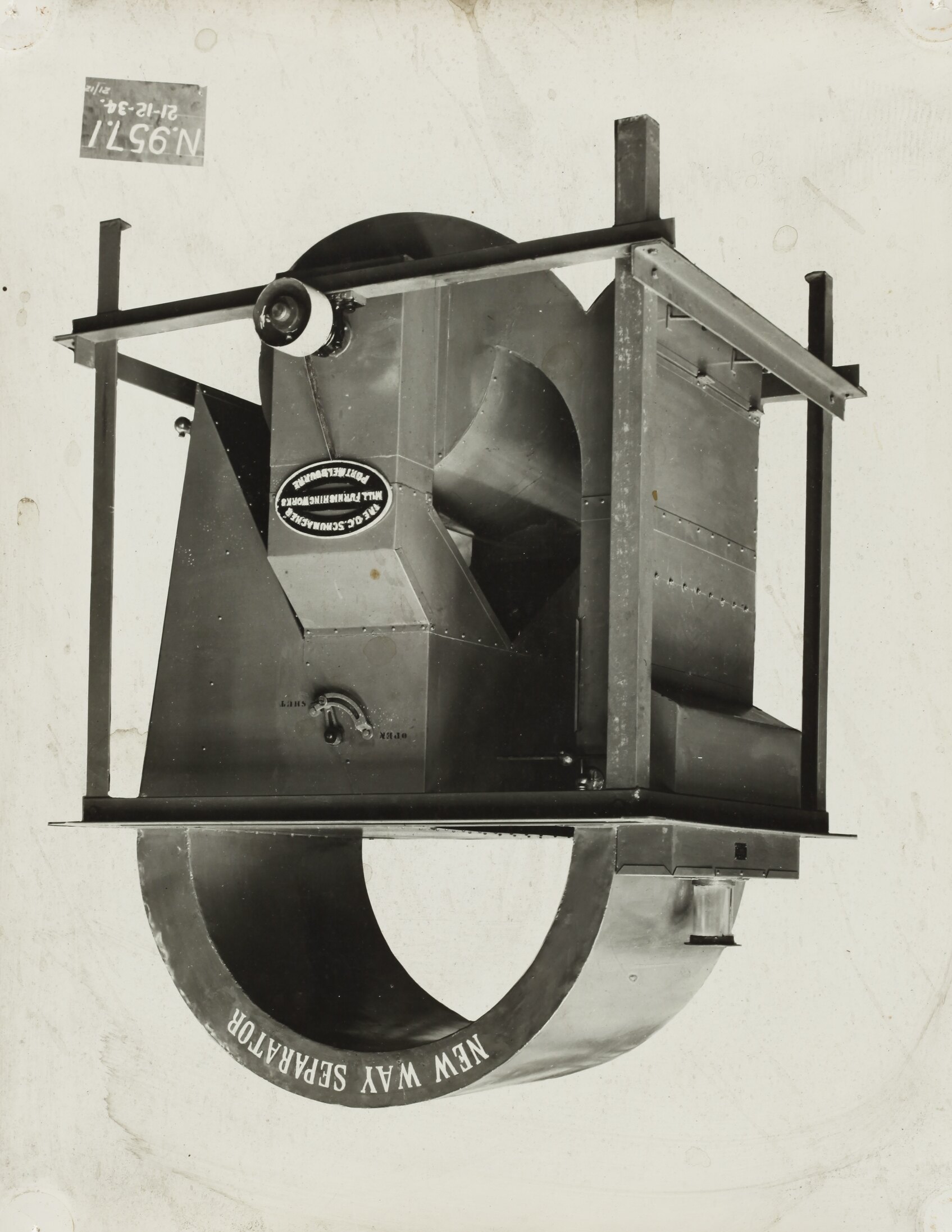 Black and white promotional image of a grading and cleaning machine. It is part of a collection of photographs and marked printer's copy used in the preparation of trade literature promoting products manufactured by the Schumacher Mill Furnishing Works Pty Ltd. The items were originally housed in a wooden filing drawer, with many filed by subject.