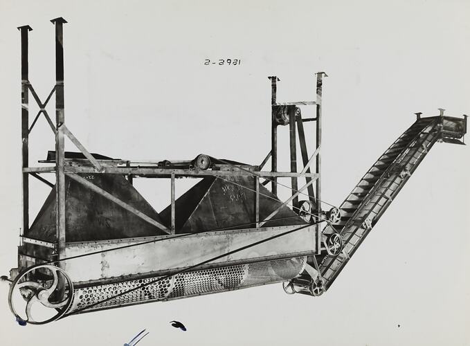 Printed on the front of photograph: '1262-2' Handwritten in black ink on the back of photograph: 'Plate under / "Plants" / 16' Printed in black ink on cream label attached to back of photograph: 'From / Schumacher Mill Furnishing Works / PROPRIETARY LIMITED. / PORT MELBOURNE, / VICTORIA.' Handwritten in black ink on cream label attached to back of photograph: 'Or Nos.43021, 43032, dated Nov. 1942 / Grading & Belt Feeding Equipment / (Trommel Screen, Feed Chute, Bucket Elevator)' Printed in red ink on the back of photograph: 'PHOTO FILE NO. / SECTION NO.' Printed in purple ink on back of photograph: 'Kerr / BROS. / COMMERCIAL / PHOTOGRAPHERS / 533 COLLINS ST. MELBOURNE' Handwritten in red pencil on the back of photograph: 'OFFICE Copy'
