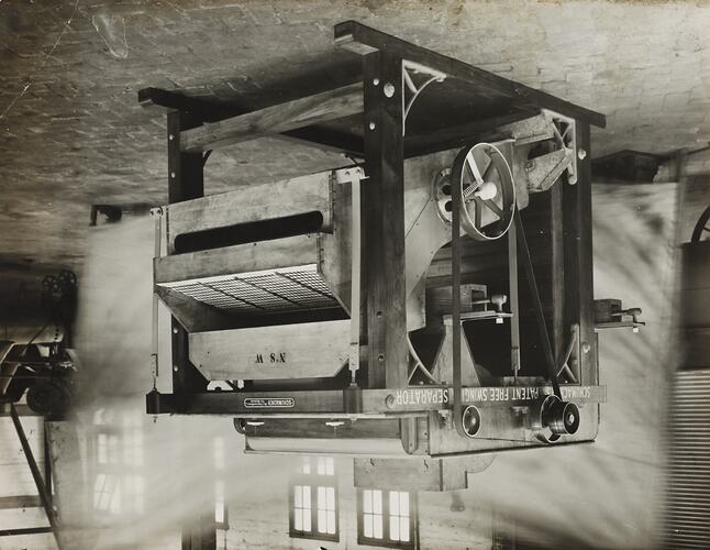 Black and white promotional image of Federal separator machine. It is part of a collection of photographs and marked printer's copy used in the preparation of trade literature promoting products manufactured by the Schumacher Mill Furnishing Works Pty Ltd. The items were originally housed in a wooden filing drawer, with many filed by subject.