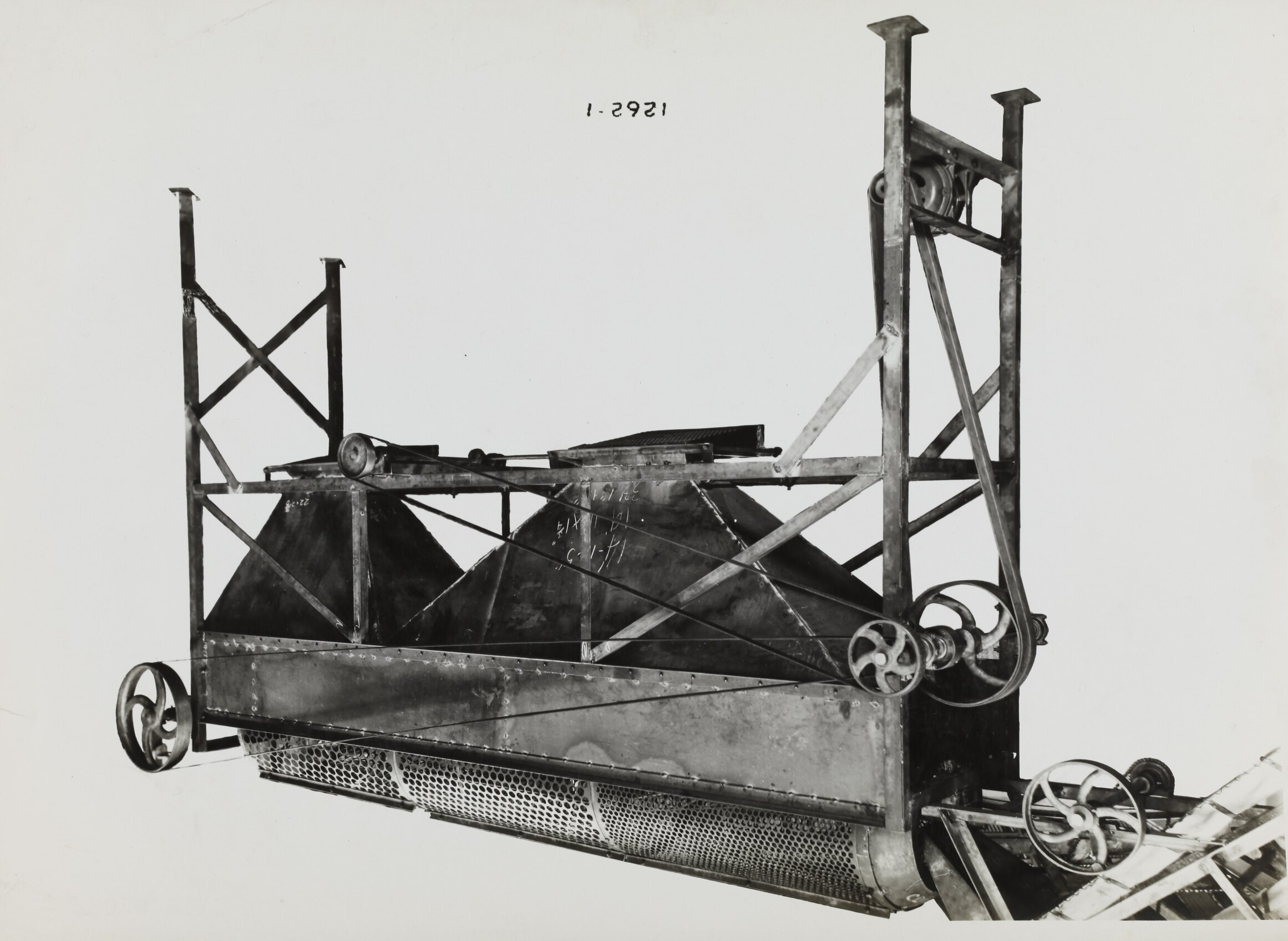 Printed on the front of photograph: '1262-1' Printed in purple ink on back of photograph: 'Kerr / BROS. / COMMERCIAL / PHOTOGRAPHERS / 533 COLLINS ST. MELBOURNE' Printed in red ink on back of photograph: 'PHOTO FILE NO. / SECTION NO. / TROMMEL SCREEN ( AND FEED CHUTE FROM SPECIAL / BUCKET ELEVATOR) FOR FRUIT GRADING / SUPPLIED TO Or.43032.' Handwritten in grey pencil on the back of photograph: '19-J / Plate under / Screens'