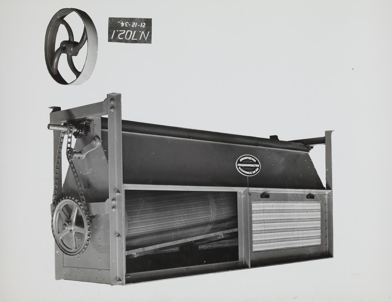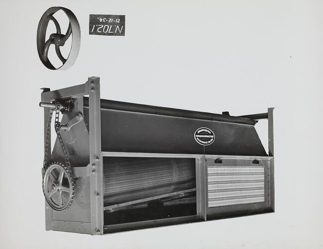 Black and white promotional image of a barley malt machine. It is part of a collection of photographs and marked printer's copy used in the preparation of trade literature promoting products manufactured by the Schumacher Mill Furnishing Works Pty Ltd. The items were originally housed in a wooden filing drawer, with many filed by subject.