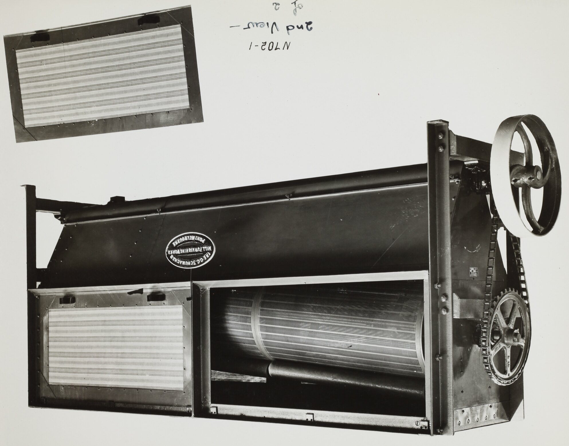 Black and white promotional image of a barley malt machine. It is part of a collection of photographs and marked printer's copy used in the preparation of trade literature promoting products manufactured by the Schumacher Mill Furnishing Works Pty Ltd. The items were originally housed in a wooden filing drawer, with many filed by subject.
