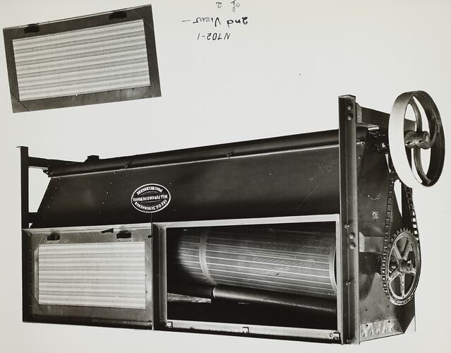 Handwritten in black ink on the front of photograph: '2nd View - / of 2' Printed on the front of photograph: 'N.702.1' Printed in purple ink on back of photograph: 'Kerr / BROS. / COMMERCIAL / PHOTOGRAPHERS / 533 COLLINS ST. MELBOURNE' Printed in red ink on back of photograph: 'SCHUMACHER MILL FURNISHING WORKS PTY. LTD. / GRAHAM ST. PORT MELBOURNE. / S. C. 7 VICTORIA. / TELEPHONE MX 2171 / BARLEY MALT DRESSING SCREEN (SCALPER) / SUPPLIED TO OR. 4/1/1935 / BALLARAT BREWING CO'