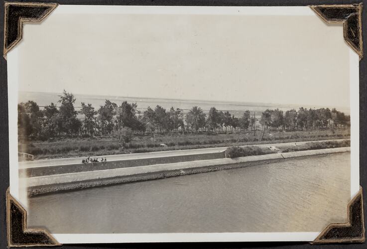 Black and white photograph titled 'Canal, motor road, railway and desert', it shows a road alongside the canal, taken circa 6-7 March 1947. It is part of a leather-bound photo album created by George Palmer during his migrant voyage from England to Australia on the RMS Orion in 1947. George migrated to Australia with his wife Gertrude and their two daughters, Shirley and Lesley.
