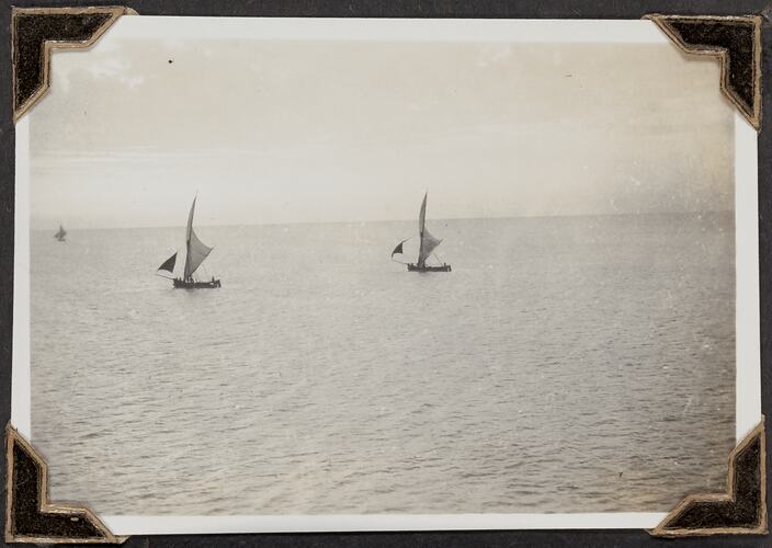 Black and white photograph titled 'Dhows', it shows three boats on the water, taken 9 March 1947. It is part of a leather-bound photo album created by George Palmer during his migrant voyage from England to Australia on the RMS Orion in 1947. George migrated to Australia with his wife Gertrude and their two daughters, Shirley and Lesley.