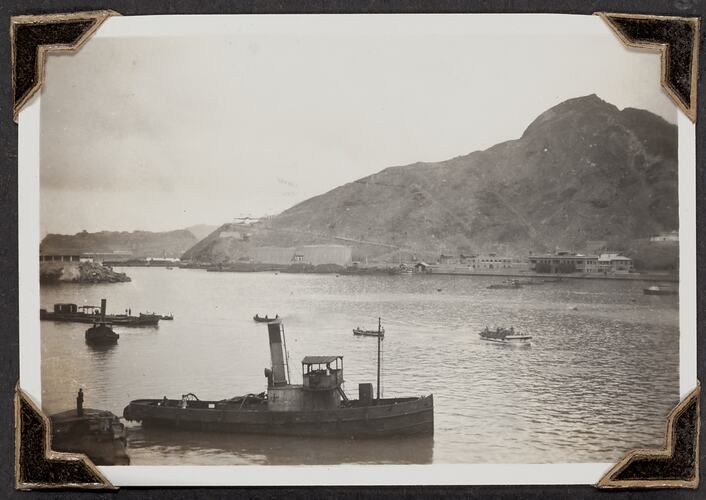 Black and white photograph titled 'Leaving Aden', it shows the Port of Aden, taken 9 March 1947. It is part of a leather-bound photo album created by George Palmer during his migrant voyage from England to Australia on the RMS Orion in 1947. George migrated to Australia with his wife Gertrude and their two daughters, Shirley and Lesley.
