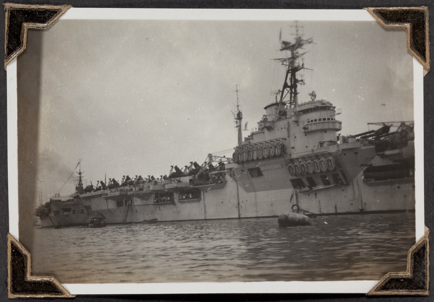 Handwritten in white ink on the top of the album page: 'Aden./ 9th March 1947' Handwritten in white ink below the photograph: 'Aircraft Carrier,/ "Theseus"