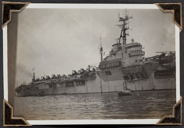 Black and white photograph titled 'Aircraft Carrier', it shows an aircraft carrier on the water, taken 9 March 1947. It is part of a leather-bound photo album created by George Palmer during his migrant voyage from England to Australia on the RMS Orion in 1947. George migrated to Australia with his wife Gertrude and their two daughters, Shirley and Lesley.