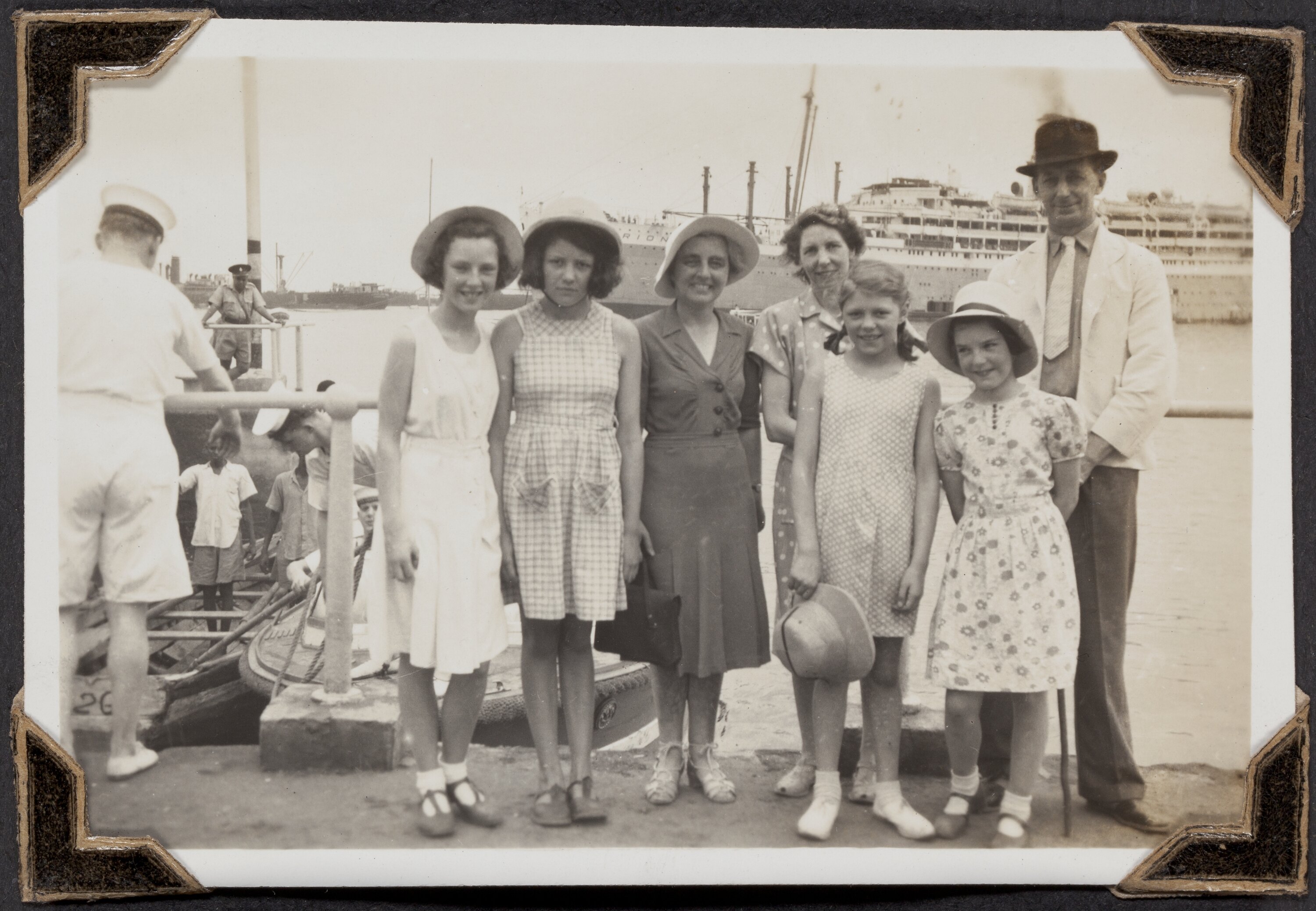 The Palmer and Godfrey families on shore in Aden, Yemen. The ship 'Orion' can be seen in the background.