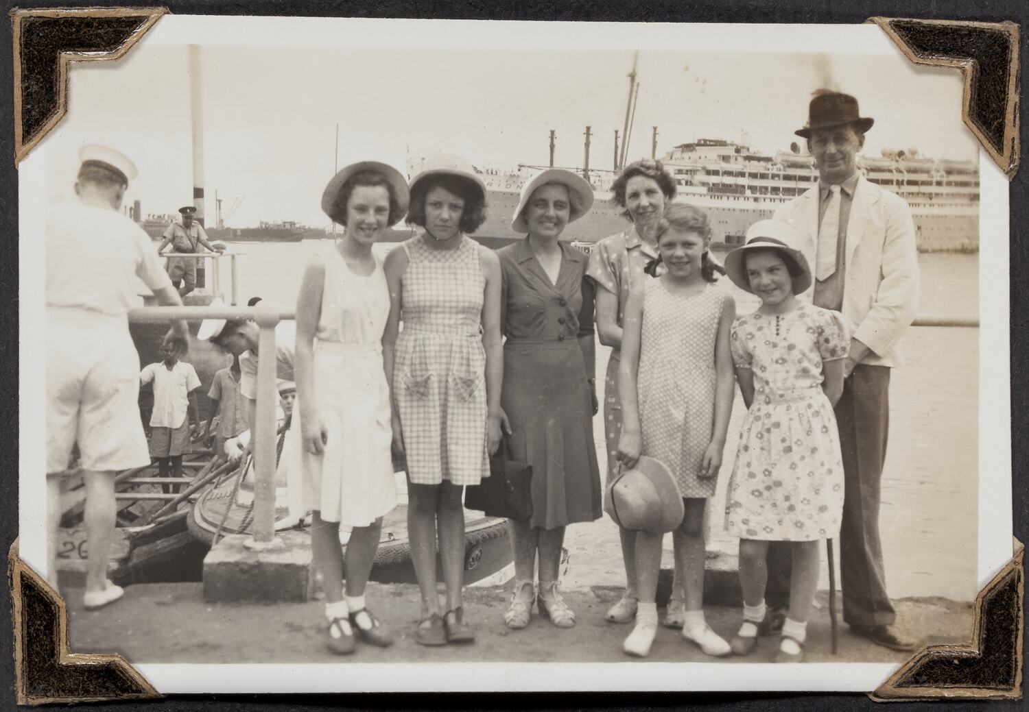 Black and white photograph titled 'On shore with Godfrey family', it shows the Palmer and Godfrey families standing in front of a ship, taken 9 March 1947. It is part of a leather-bound photo album created by George Palmer during his migrant voyage from England to Australia on the RMS Orion in 1947. George migrated to Australia with his wife Gertrude and their two daughters, Shirley and Lesley.