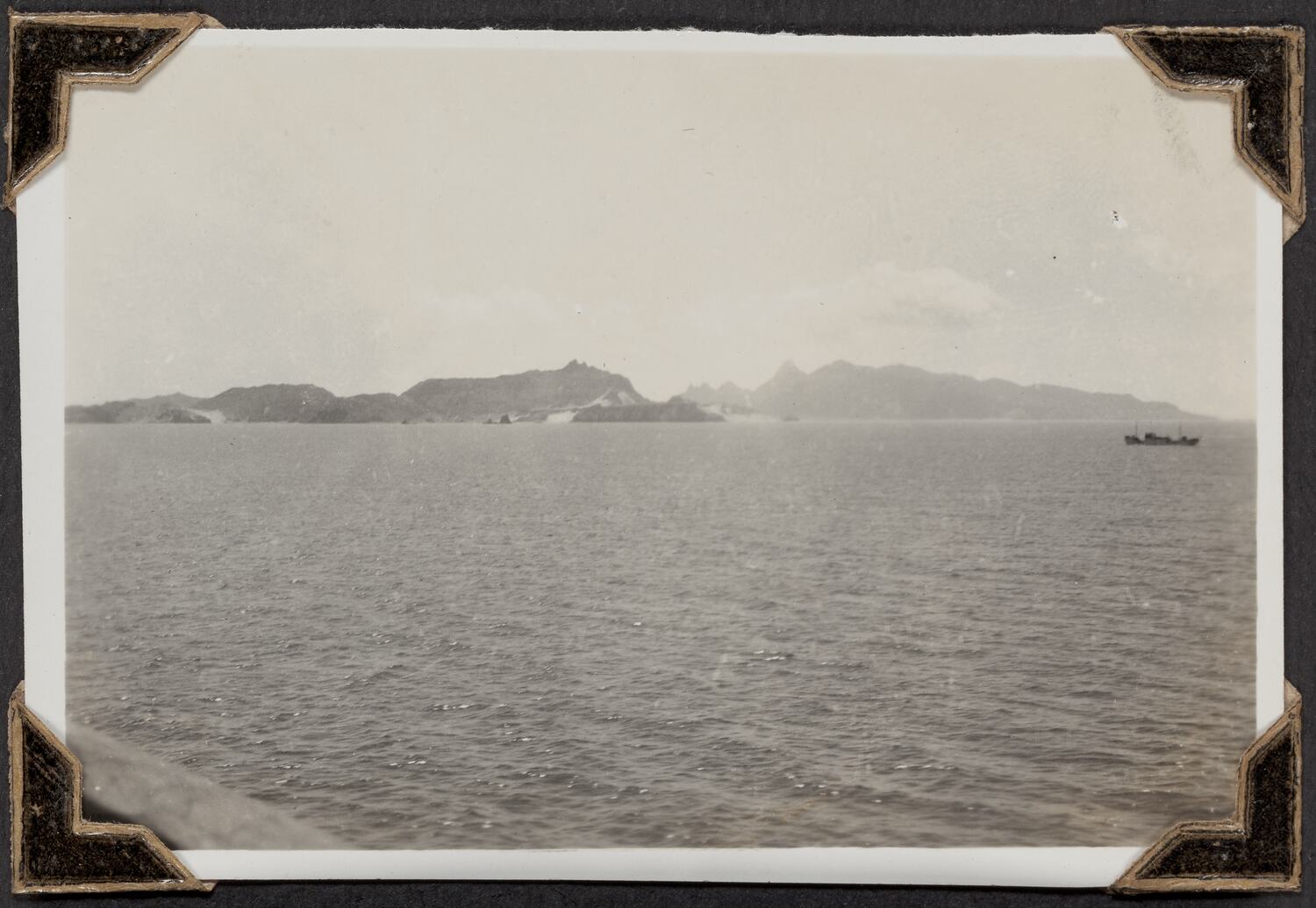 Black and white photograph titled 'Gulf of Aden', it shows mountains in the distance, taken circa 10 March 1947. It is part of a leather-bound photo album created by George Palmer during his migrant voyage from England to Australia on the RMS Orion in 1947. George migrated to Australia with his wife Gertrude and their two daughters, Shirley and Lesley.