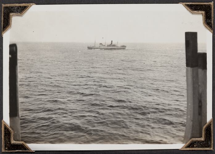 View from the ship RMS Orion looking out to another boat in the distance. The distant boat is possibly used for shipping animals.