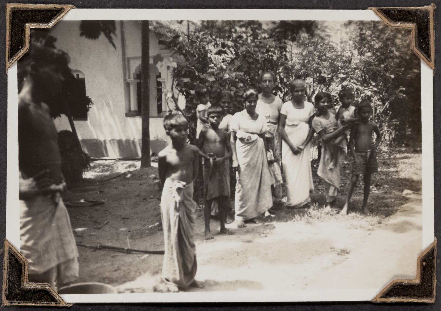 Black and white photograph titled 'Natives who Sold Pineapples', it shows a group of women and children, taken 14 March 1947. It is part of a leather-bound photo album created by George Palmer during his migrant voyage from England to Australia on the RMS Orion in 1947. George migrated to Australia with his wife Gertrude and their two daughters, Shirley and Lesley.