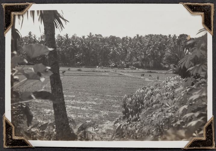 Black and white photograph titled 'Paddy fields, Coconut groves and Banana trees', it shows a landscape with rice fields, taken 14 March 1947. It is part of a leather-bound photo album created by George Palmer during his migrant voyage from England to Australia on the RMS Orion in 1947. George migrated to Australia with his wife Gertrude and their two daughters, Shirley and Lesley.