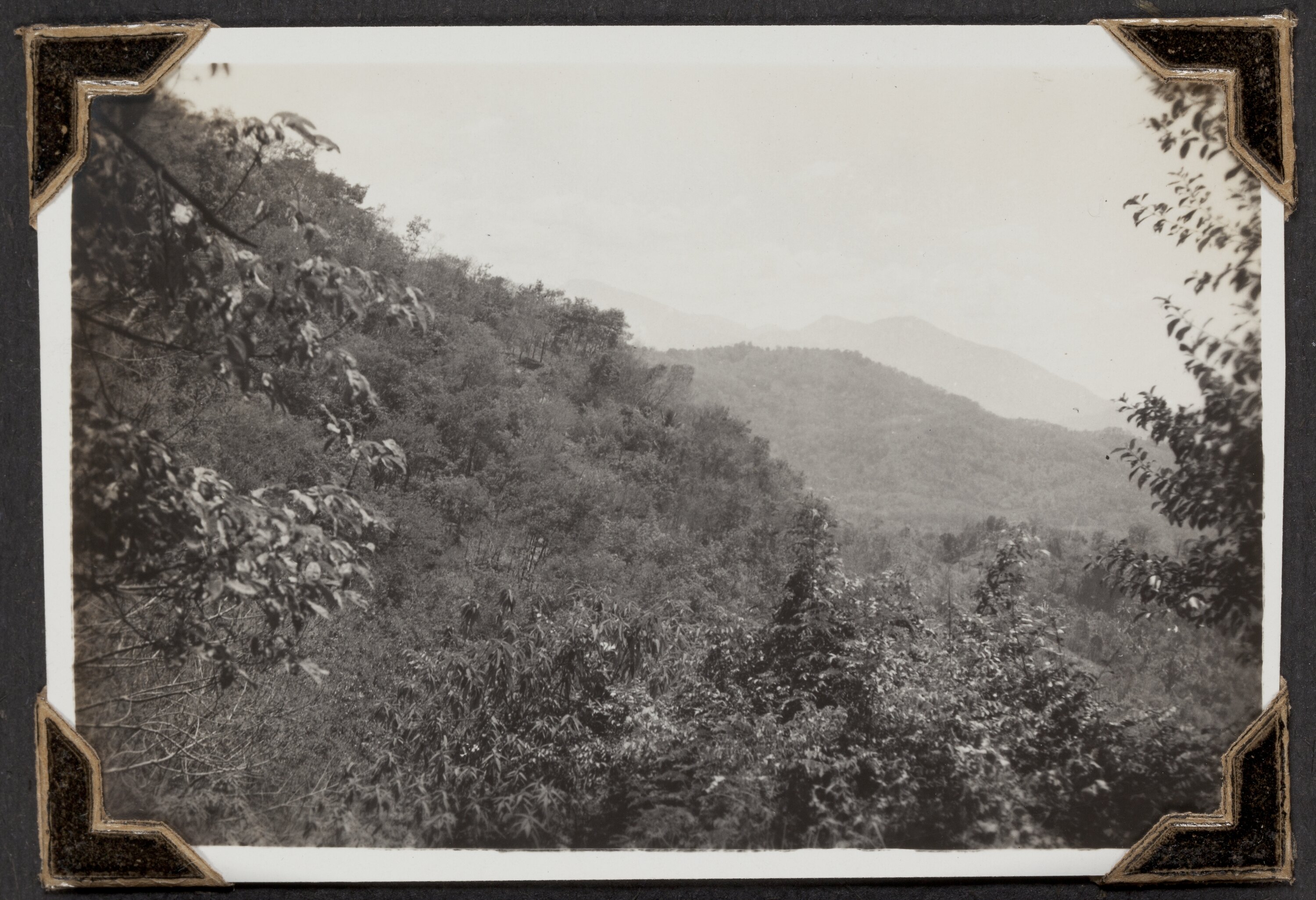 Black and white photograph titled 'Near Polgahawela', it shows a mountain landscape, taken 14 March 1947. It is part of a leather-bound photo album created by George Palmer during his migrant voyage from England to Australia on the RMS Orion in 1947. George migrated to Australia with his wife Gertrude and their two daughters, Shirley and Lesley.
