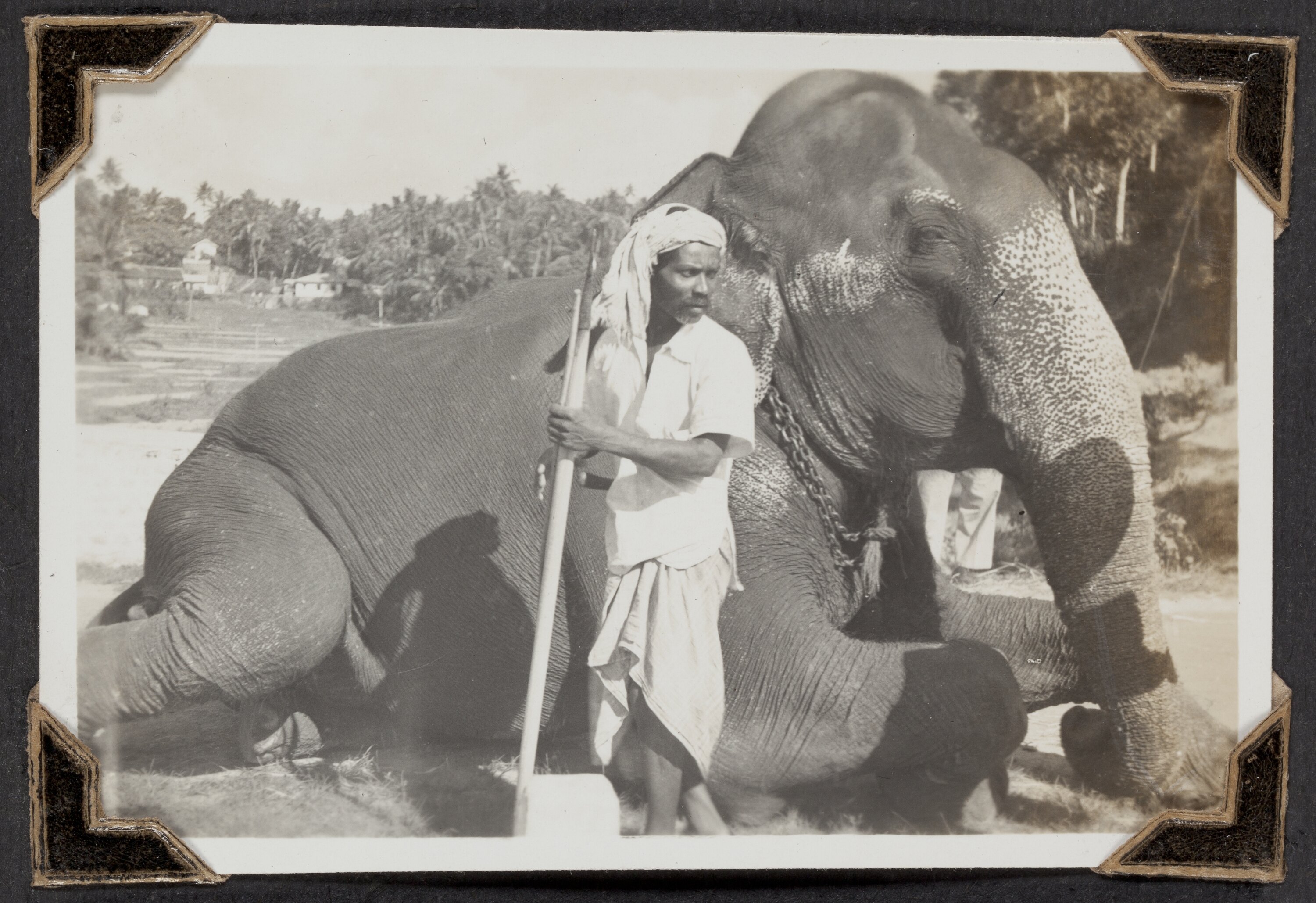 Handwritten in white ink along the top of the album page: 'Colombo to Kandy [centre of page] 14th March 1947 [right of page]' Handwritten in white ink below the photograph: 'Elephant man with/ largest elephant.'