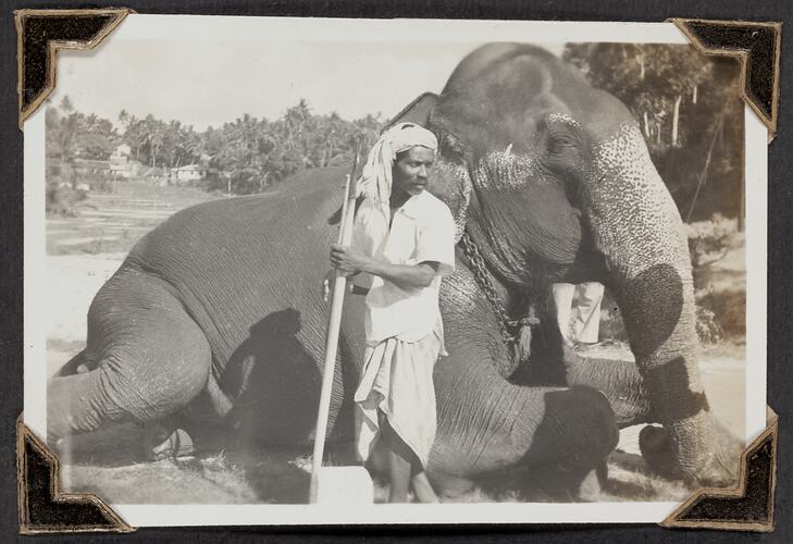 Black and white photograph titled 'Elephant Man With Largest Elephant', it shows a man standing with an Elephant, taken 14 March 1947. It is part of a leather-bound photo album created by George Palmer during his migrant voyage from England to Australia on the RMS Orion in 1947. George migrated to Australia with his wife Gertrude and their two daughters, Shirley and Lesley.