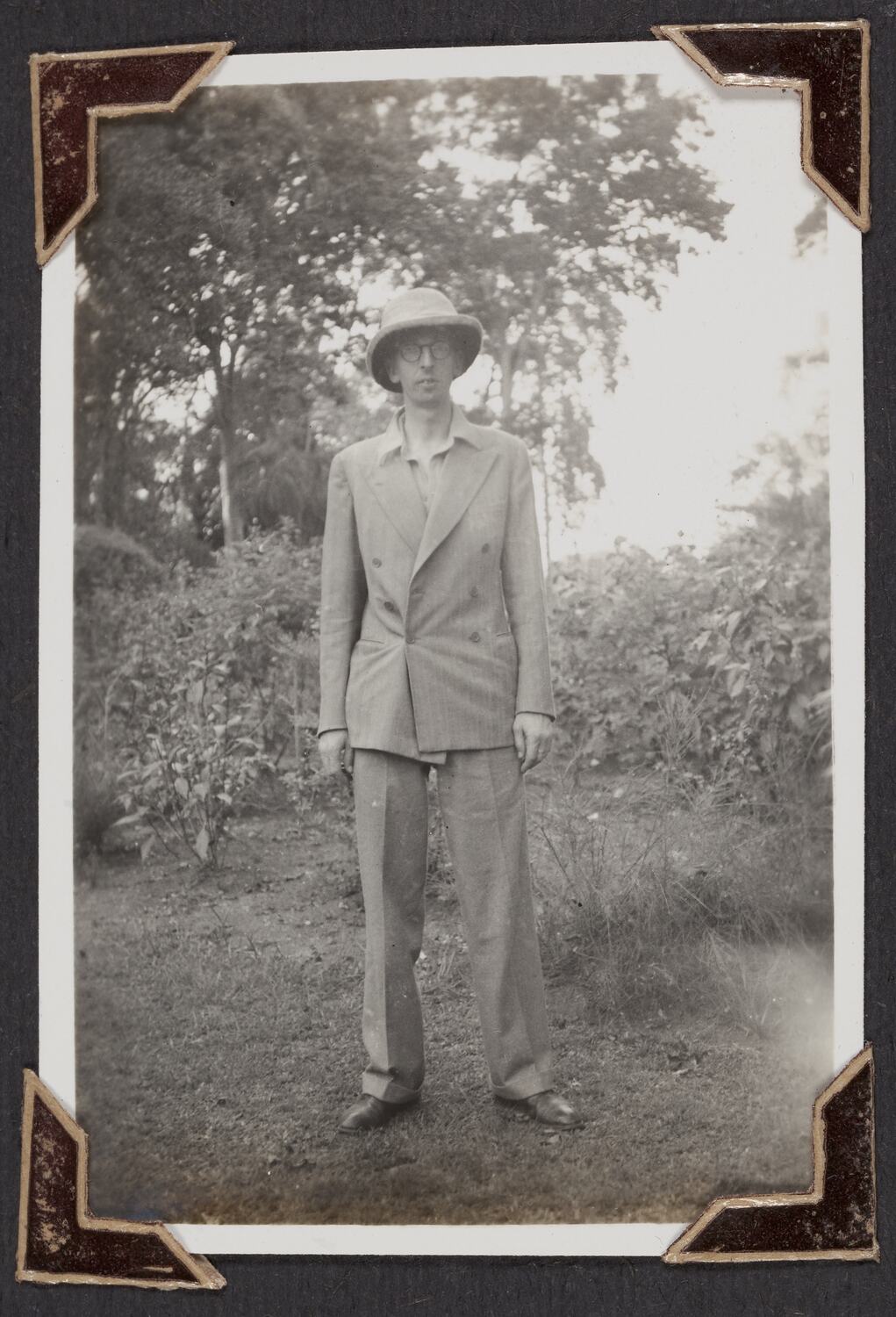 George Palmer in full view wearing a suit and hat at the Botanical Gardens in Kandy, Sri Lanka.