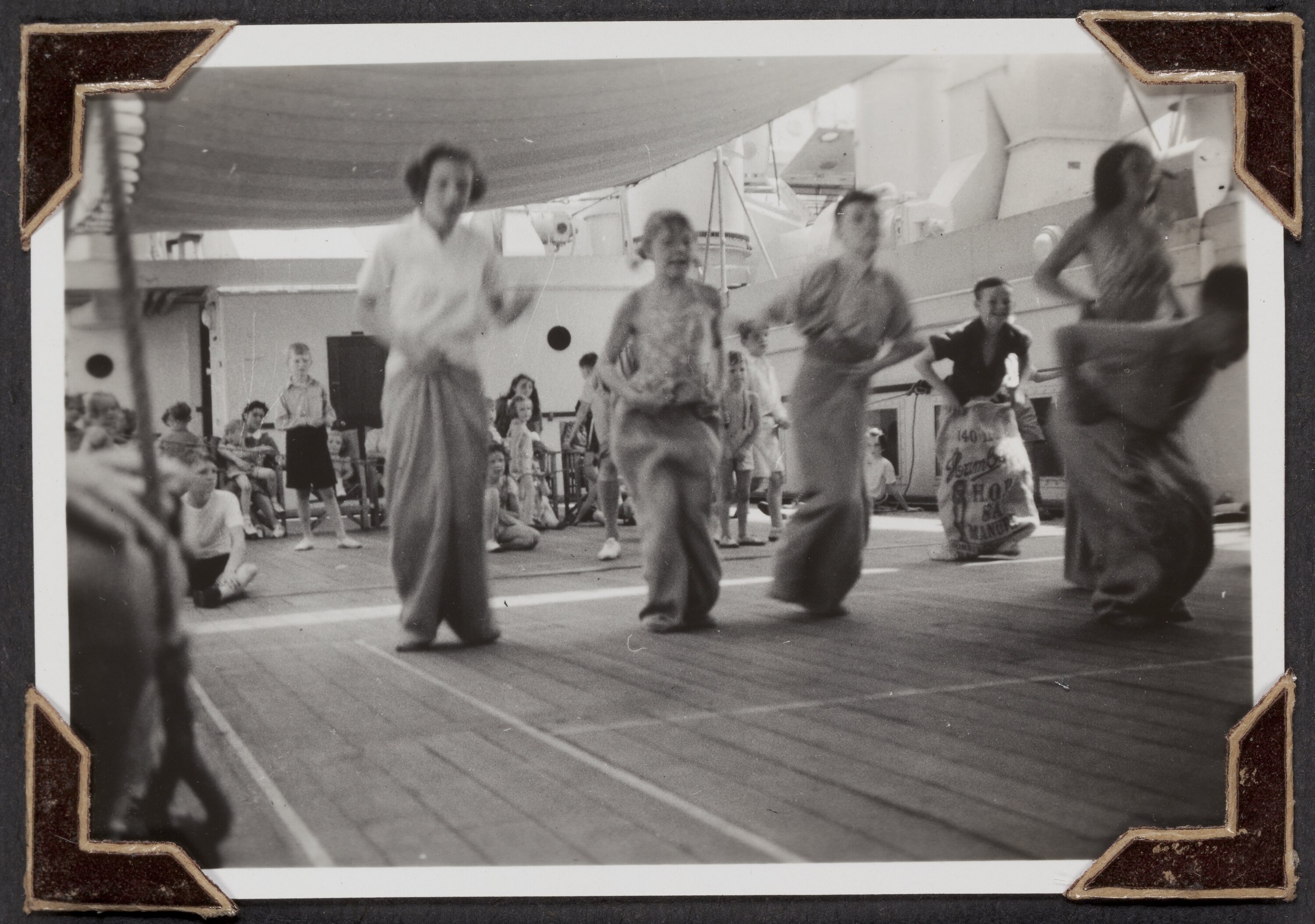 Black and white photograph titled 'Sack Race', it shows children in a sack race on the RMS Orion, taken March 1947. It is part of a leather-bound photo album created by George Palmer during his migrant voyage from England to Australia on the RMS Orion in 1947. George migrated to Australia with his wife Gertrude and their two daughters, Shirley and Lesley.
