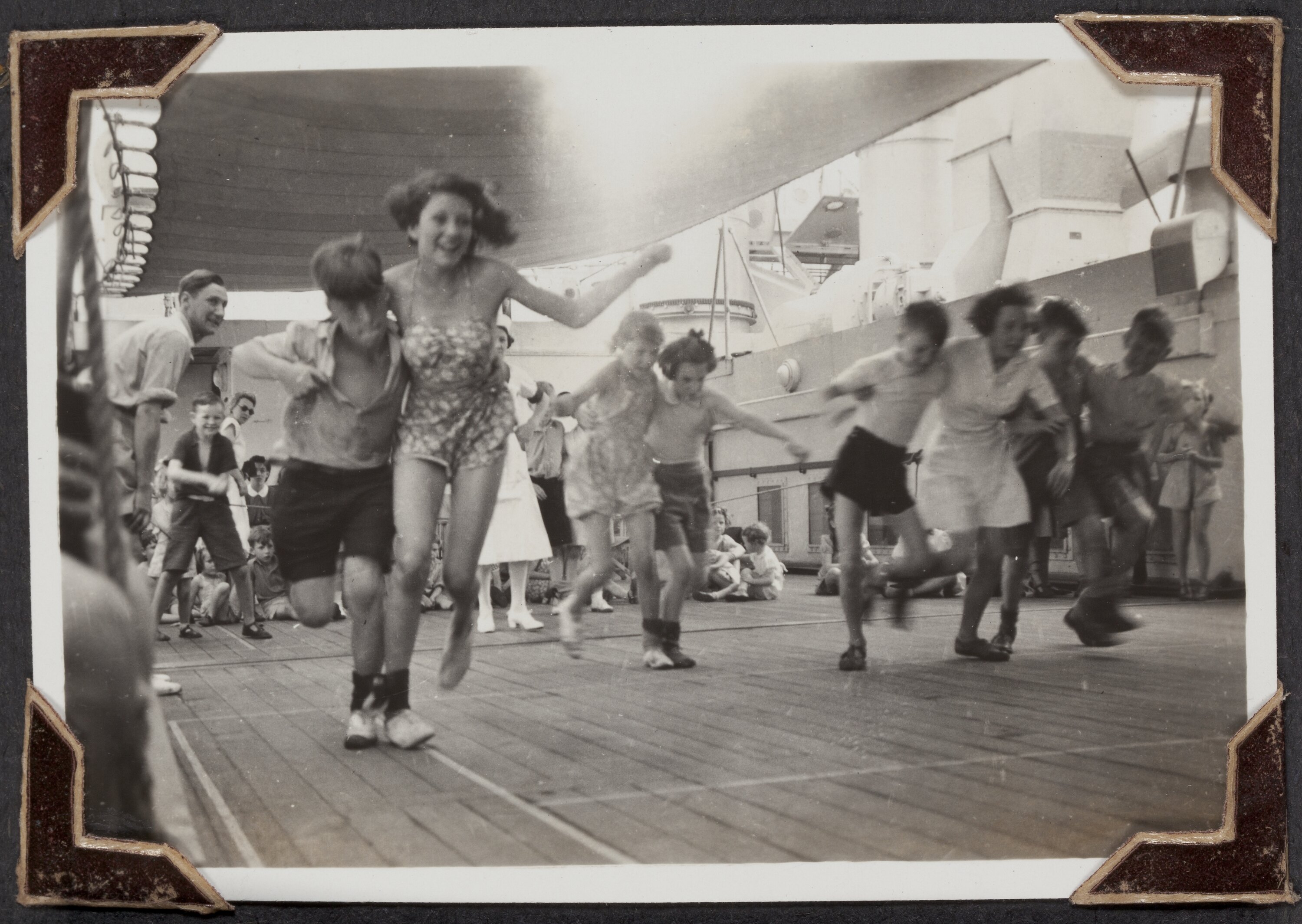 Black and white photograph titled 'Three-Legged Race', it shows children in a three-legged race on the RMS Orion, taken March 1947. It is part of a leather-bound photo album created by George Palmer during his migrant voyage from England to Australia on the RMS Orion in 1947. George migrated to Australia with his wife Gertrude and their two daughters, Shirley and Lesley.