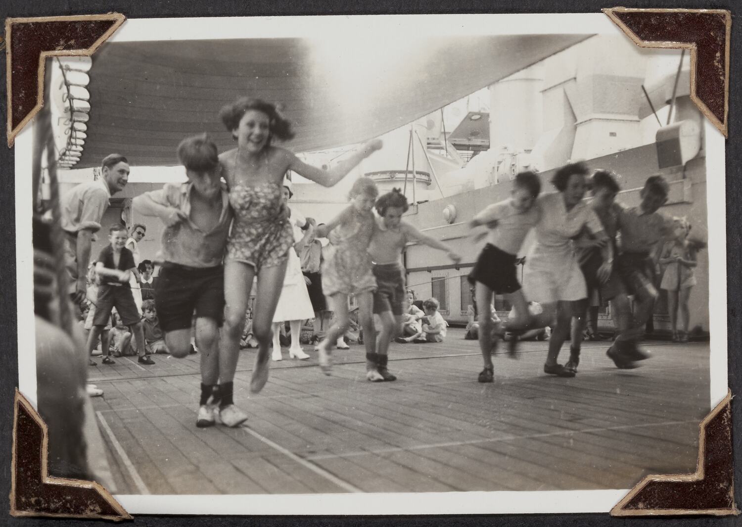 Four pairs of children competing in a three-legged race on board RMS Orion. There is an audience of adults and children looking on in the background.
