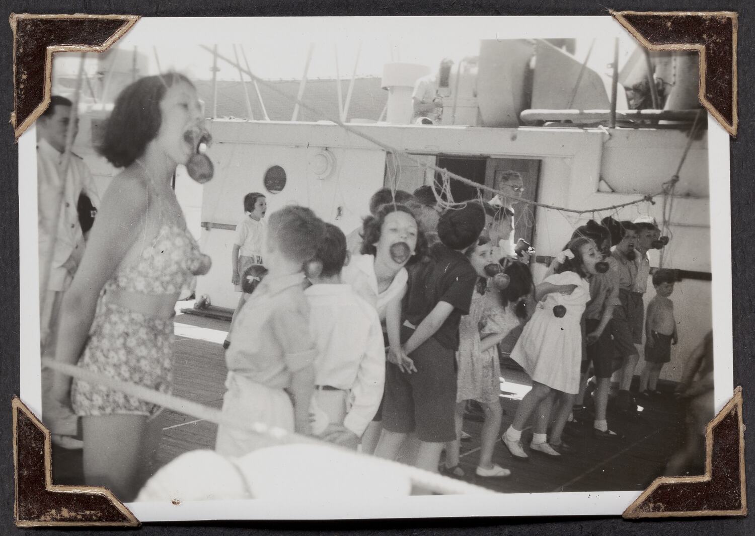 Black and white photograph titled 'Biting the Elusive Apple', it shows children playing a game on the RMS Orion, taken March 1947. It is part of a leather-bound photo album created by George Palmer during his migrant voyage from England to Australia on the RMS Orion in 1947. George migrated to Australia with his wife Gertrude and their two daughters, Shirley and Lesley.