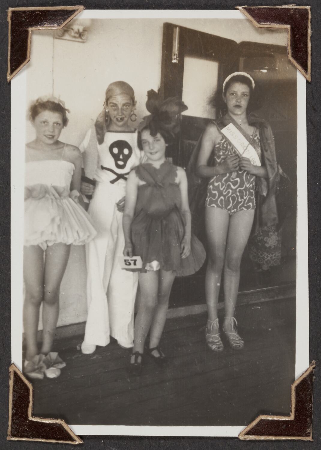 Four children in fancy dress costume on board RMS Orion. Pictured left to right is Jennifer Godfrey dressed as Columbine, Shirley Palmer a pirate, Lesley Palmer a poppy and Shirley Godfrey as Miss Orion 1947.
