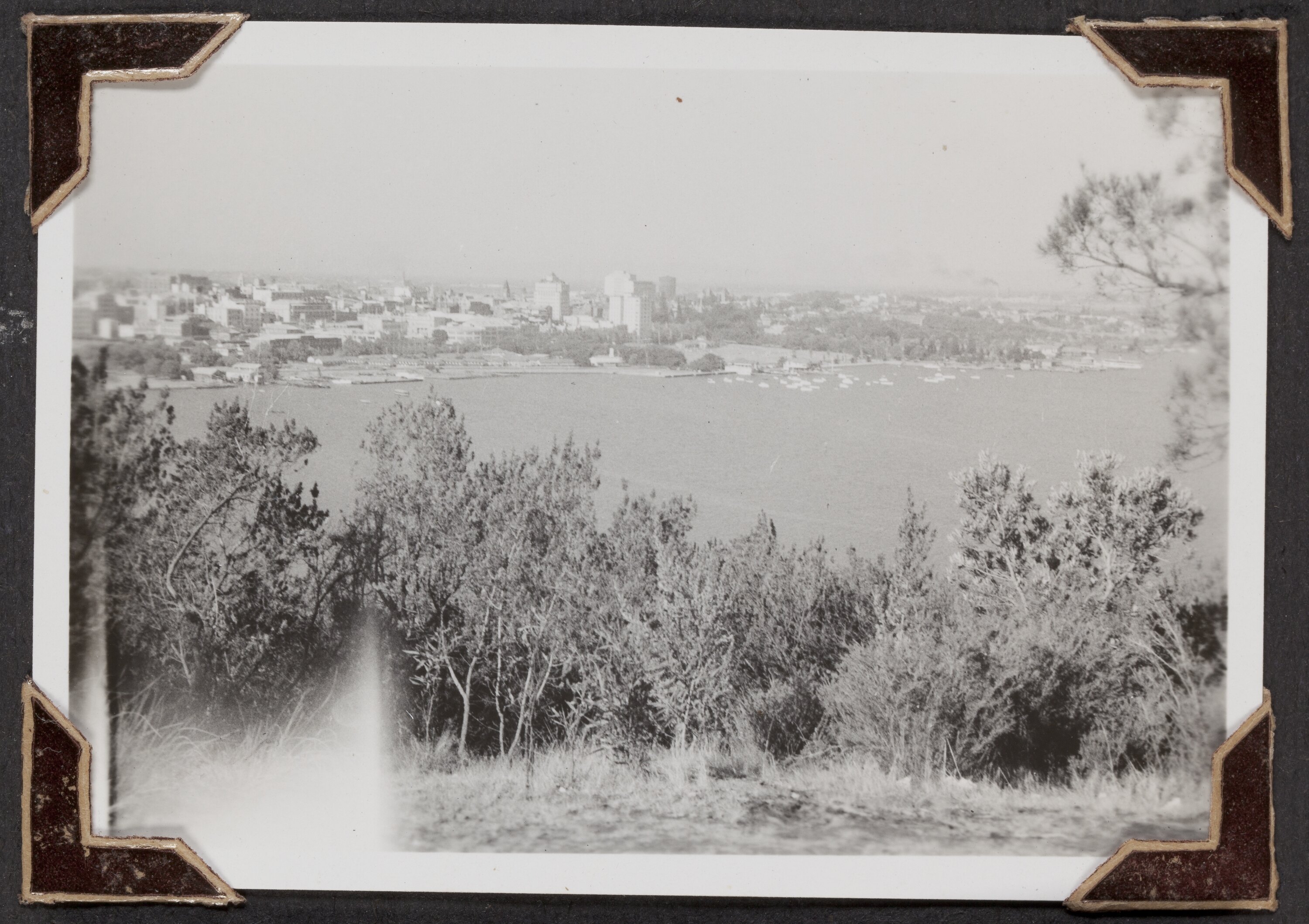 Black and white photograph titled 'Swan River and Perth Waterfront', it shows the city of Perth and the Swan River, taken 22 March 1947. It is part of a leather-bound photo album created by George Palmer during his migrant voyage from England to Australia on the RMS Orion in 1947. George migrated to Australia with his wife Gertrude and their two daughters, Shirley and Lesley.