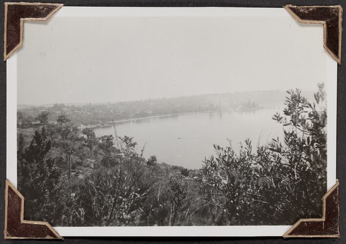 Black and white photograph titled 'Across Swan River', it shows the Swan River, taken 22 March 1947. It is part of a leather-bound photo album created by George Palmer during his migrant voyage from England to Australia on the RMS Orion in 1947. George migrated to Australia with his wife Gertrude and their two daughters, Shirley and Lesley.