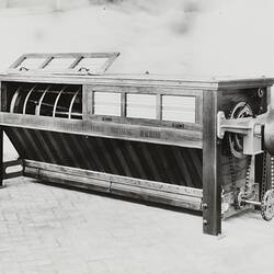 Black and white promotional image of a centrifugal dresser. It is part of a collection of photographs and marked printer's copy used in the preparation of trade literature promoting products manufactured by the Schumacher Mill Furnishing Works Pty Ltd. The items were originally housed in a wooden filing drawer, with many filed by subject.