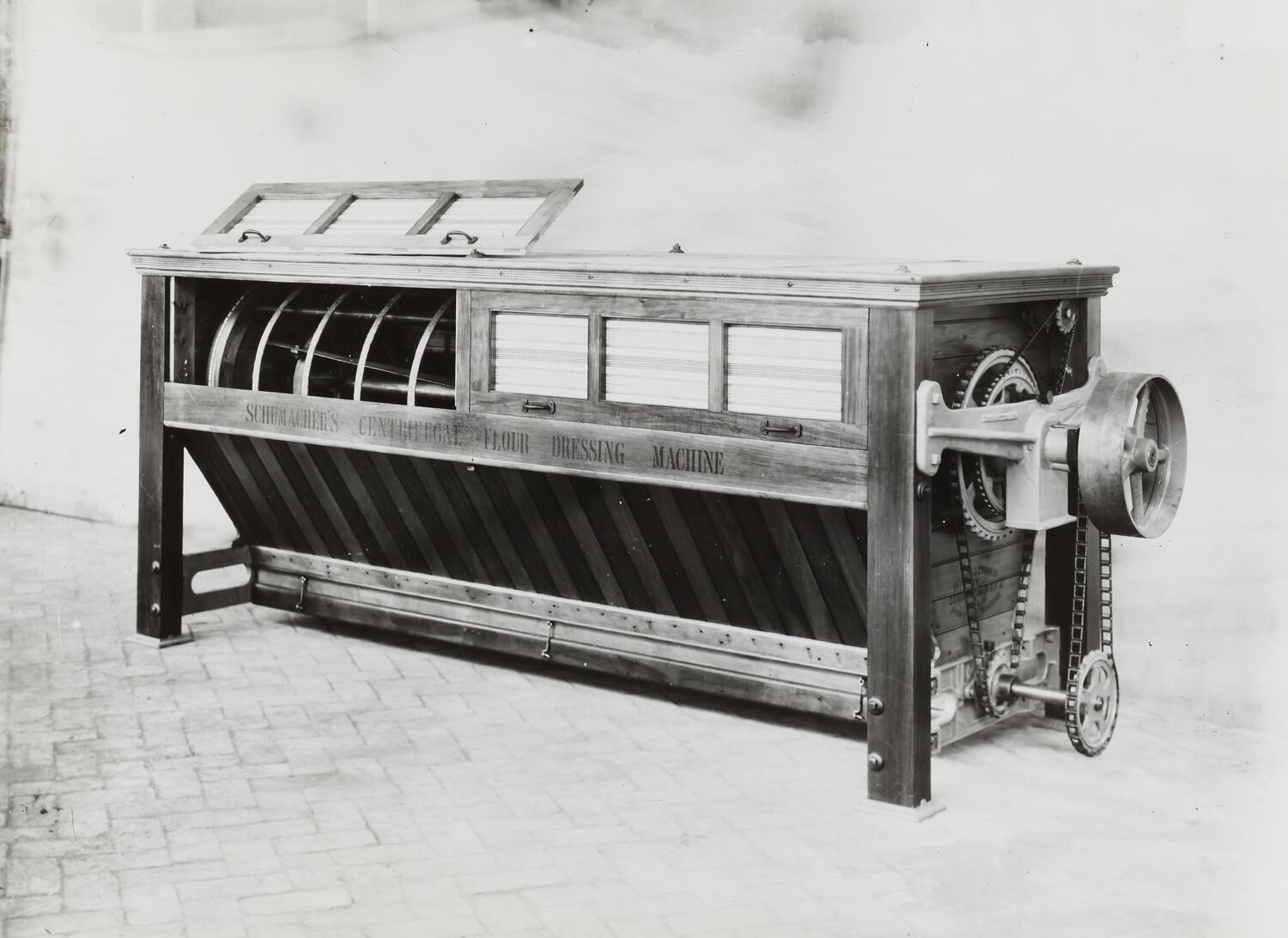 Black and white promotional image of a centrifugal dresser. It is part of a collection of photographs and marked printer's copy used in the preparation of trade literature promoting products manufactured by the Schumacher Mill Furnishing Works Pty Ltd. The items were originally housed in a wooden filing drawer, with many filed by subject.
