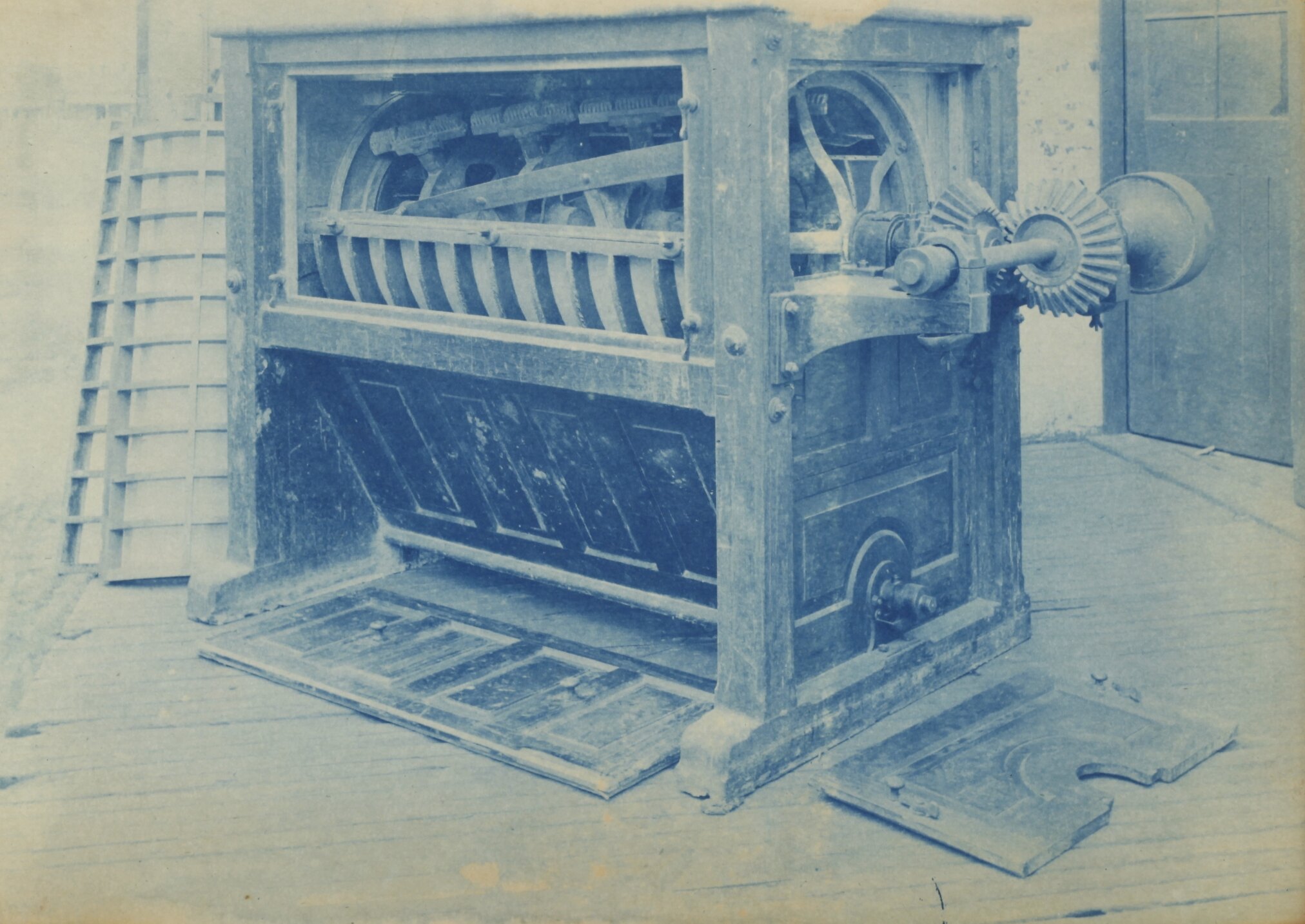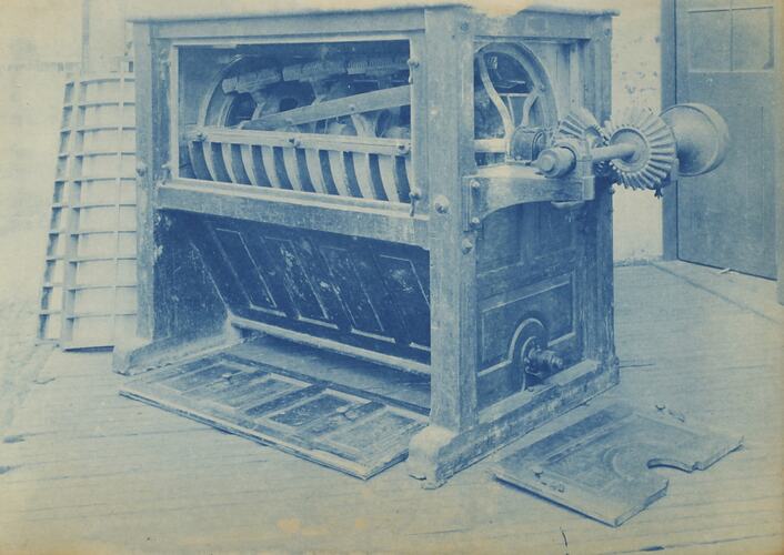 Cyanotype promotional image of a sifting machine. It is part of a collection of photographs and marked printer's copy used in the preparation of trade literature promoting products manufactured by the Schumacher Mill Furnishing Works Pty Ltd. The items were originally housed in a wooden filing drawer, with many filed by subject.