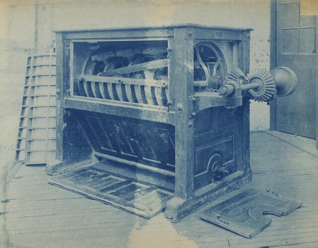 Cyanotype promotional image of a sifting machine. It is part of a collection of photographs and marked printer's copy used in the preparation of trade literature promoting products manufactured by the Schumacher Mill Furnishing Works Pty Ltd. The items were originally housed in a wooden filing drawer, with many filed by subject.