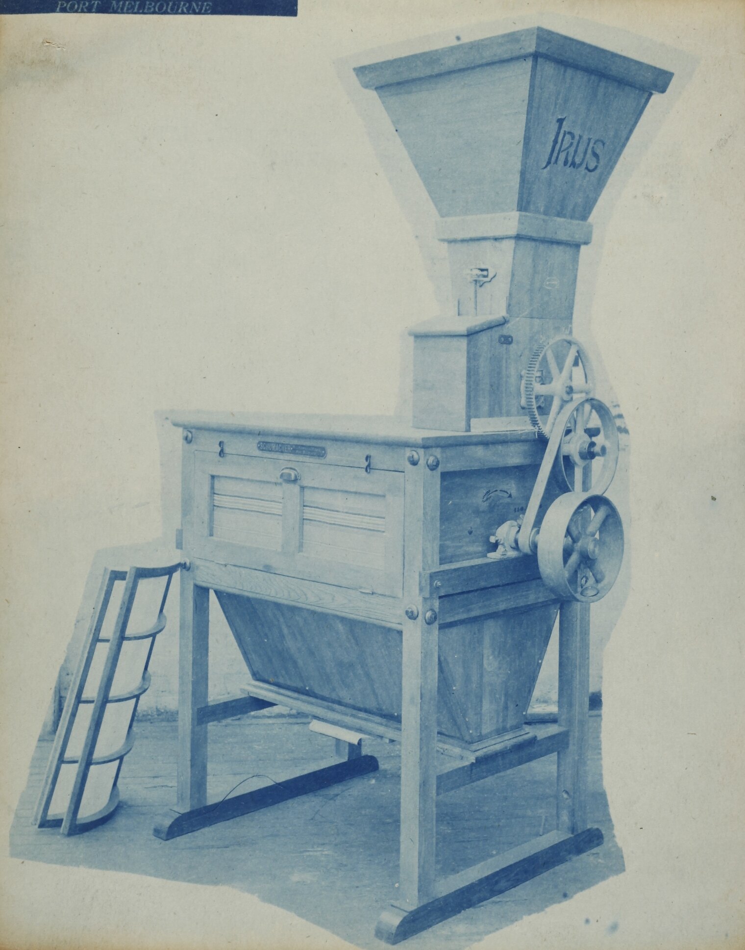 Cyanotype promotional image of a machine. It is part of a collection of photographs and marked printer's copy used in the preparation of trade literature promoting products manufactured by the Schumacher Mill Furnishing Works Pty Ltd. The items were originally housed in a wooden filing drawer, with many filed by subject.