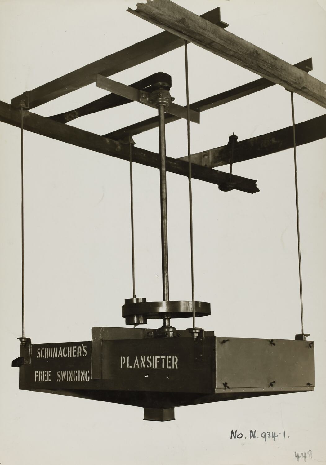 Black and white promotional image of a plainsifter. It is part of a collection of photographs and marked printer's copy used in the preparation of trade literature promoting products manufactured by the Schumacher Mill Furnishing Works Pty Ltd. The items were originally housed in a wooden filing drawer, with many filed by subject. This photograph was previously filed under 'GRINDERS'.