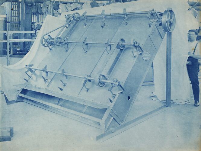 Cyanotype promotional image of an employee standing behind a perfection screen in factory. It is part of a collection of photographs and marked printer's copy used in the preparation of trade literature promoting products manufactured by the Schumacher Mill Furnishing Works Pty Ltd. The items were originally housed in a wooden filing drawer, with many filed by subject. This photograph was previously filed under 'GRINDERS'.