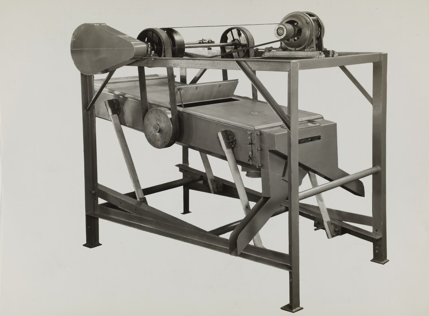 Black and white promotional image of a vibratory sifter. It is part of a collection of photographs and marked printer's copy used in the preparation of trade literature promoting products manufactured by the Schumacher Mill Furnishing Works Pty Ltd. The items were originally housed in a wooden filing drawer, with many filed by subject. This photograph was previously filed under 'MILK POWDER'.